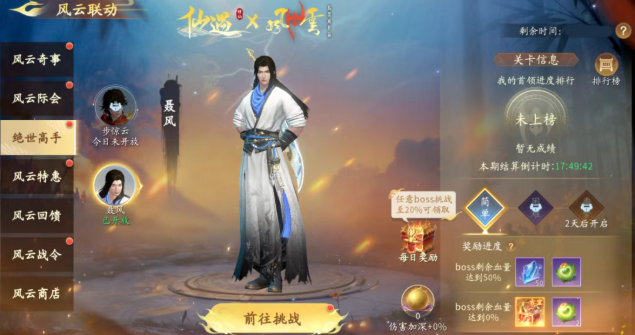 聂风、步惊云两大高手等你来挑战!前6天每日轮换一位开放挑战,第7天起全部开启,挑战难度将逐天解锁,完整挑战上一难度即可解锁更高难度挑战!每个难度都有对应进度奖励,达标即可领取风云秘宝!挑战血量达到20%之后还可每日领取一份奖励哦!仙友们还可以在风云商店兑换大力丸,服用后可提高挑战高手时的伤害