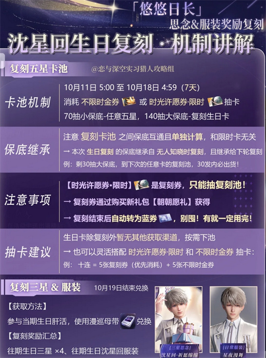 恋与深空将在10月11日开启沈星回生日活动,本次活动持续时间为一周,玩家们参与活动可以免费获得拍照动作、限定称号、Q版头像等,下面带来2025沈星回生日活动攻略,各位来看看吧。