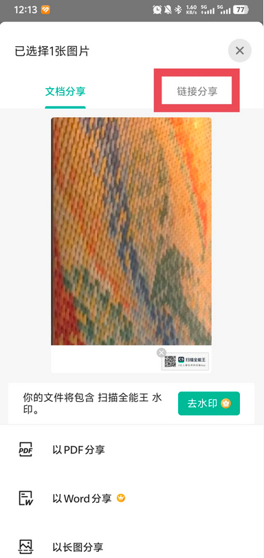 3.选择链接分享: 在“文档分享”界面,你会看到“去水印”功能有 会员锁。不用管它! 选择 “链接分享” 方式。