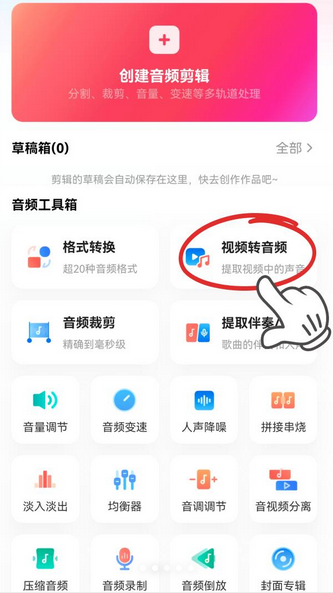 1.打开手机上的【音频快剪app】,然后点开我们需要使用的功能【视频转音频】;