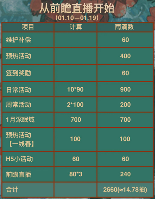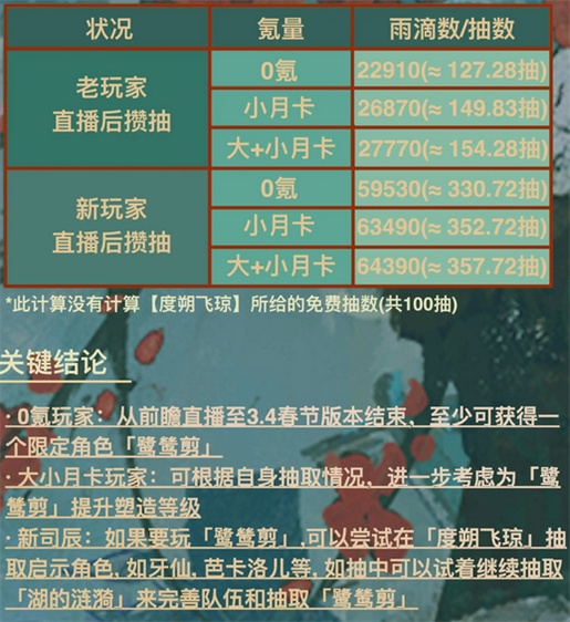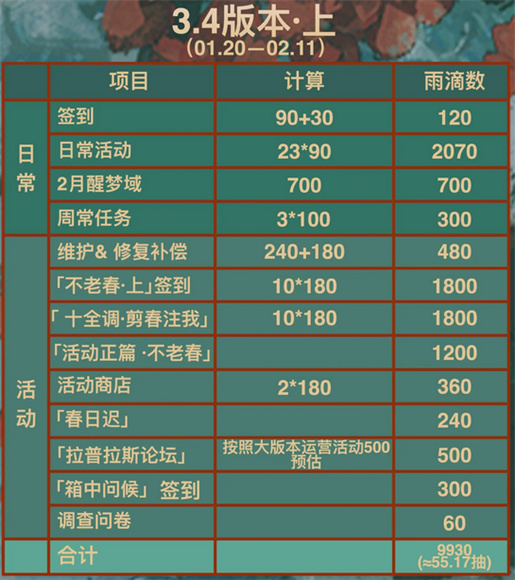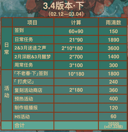 重返未来3.4春节版本更新内容相当丰富,大家可以在新版本中获得大量的雨滴,不过零氪和月卡玩家获得的雨滴数量有差别,这里带来3.4春节版本雨滴获取数量详细计算,朋友们来看看吧。