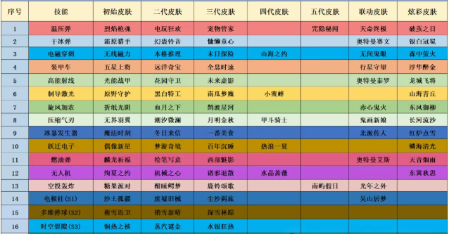 三代制导激光皮(南瓜梦魇)、四代跃迁(热浪一夏)、四代电皮(山海之约)