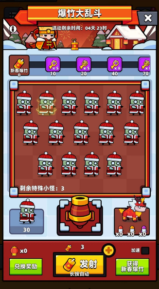 2.爆竹使用:点击单次发射、长按自动连续打击僵尸,打击成功掉落新春灯笼——这是兑换商店的唯一核心货币。