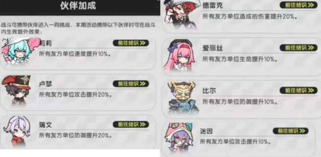 可以携带伙伴进行挑战,每个伙伴给的加属性加成不一样,正常我们带卢瑟、德雷克、桃夭就行了;