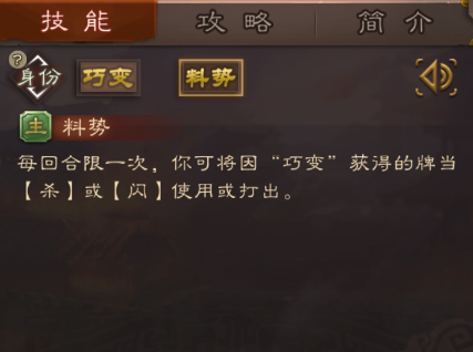2.料势与巧变形成了完美的技能联动。它将“巧变”获得的资源(别人的手牌)即时转化为【杀】或【闪】,解决了攻击牌来源和关键防御的问题,使整个技能组闭环,自给自足。